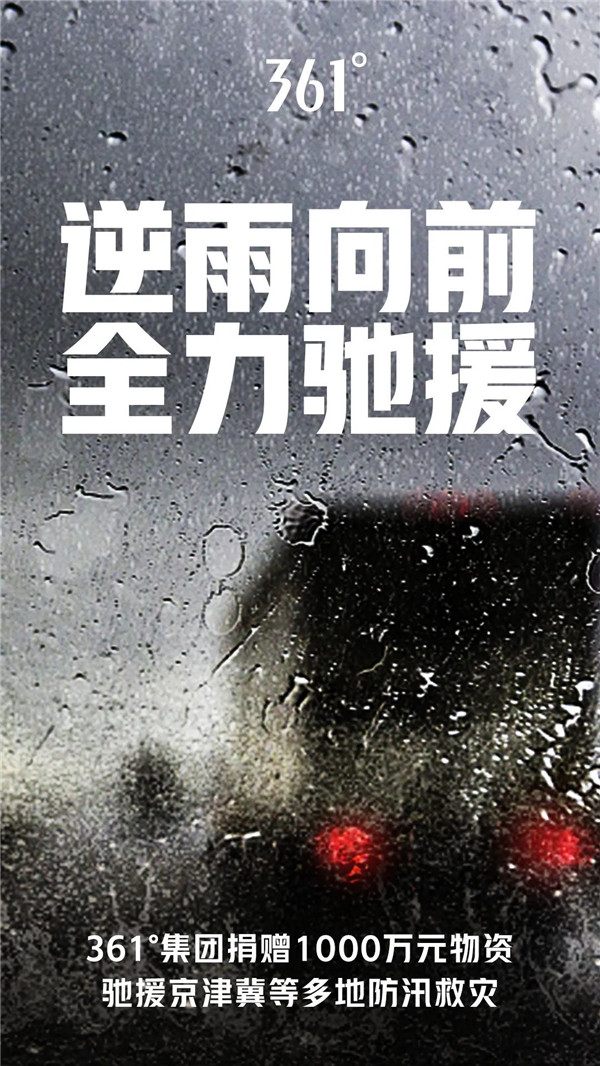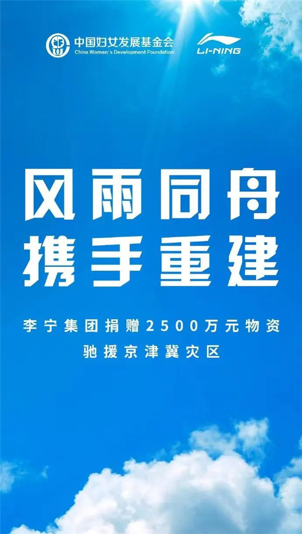 “風(fēng)雨同舟,攜手重建”,中國服裝協(xié)會理事單位——李寧集團通過中國婦女發(fā)展基金會捐贈2500萬元物資,用于支持京津冀抗汛救援及災(zāi)后重建工作。 “逆雨向前,全力馳援”,中國服裝協(xié)會理事單位——三六一度集團向中國青少年發(fā)展基金會捐贈1000萬元物資馳援京津冀閩等多地災(zāi)區(qū),為一線防汛救災(zāi)工作盡一份力。