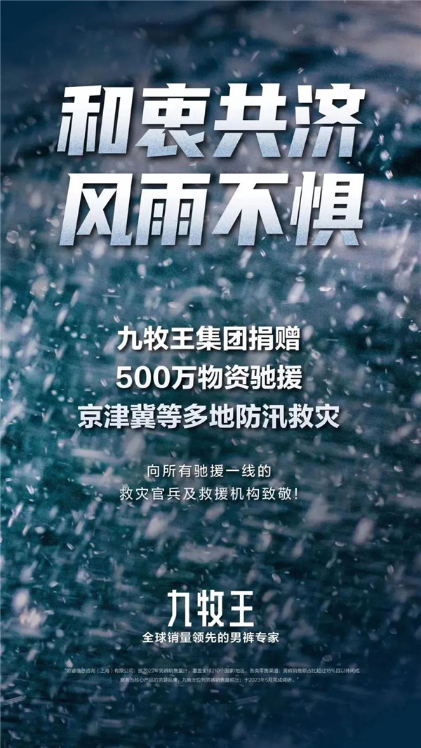 “和衷共濟,風(fēng)雨不懼”,中國服裝協(xié)會副會長單位——九牧王股份有限公司攜旗下品牌九牧王男褲專家、FUN、ZIOZIA緊急捐贈物資500萬元,馳援防汛救災(zāi),用于保障京津冀及泉州等受災(zāi)地區(qū)的人員安全、應(yīng)急救援和災(zāi)后重建等工作。