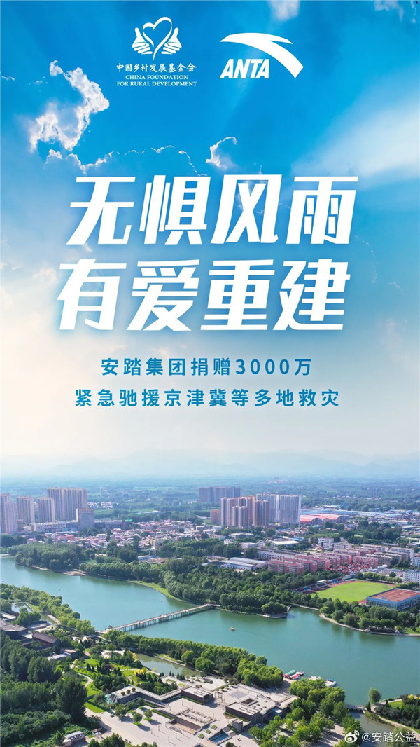 連日來,受臺風(fēng)“杜蘇芮”影響,京津冀多地遭遇持續(xù)強降雨,由此引發(fā)的災(zāi)情及后續(xù)應(yīng)急救援工作備受關(guān)注。在一些救災(zāi)組織積極響應(yīng)投入一線救災(zāi)的同時,多家服裝企業(yè)及電商平臺相關(guān)企業(yè)也第一時間以不同方式參與到救援當(dāng)中。 “無懼風(fēng)雨,有愛重建”,安踏集團向中國鄉(xiāng)村發(fā)展基金會緊急捐贈3000萬元,包括2000萬元物資及1000萬元現(xiàn)金,用于響應(yīng)京津冀及福建泉州受災(zāi)地區(qū)的災(zāi)情救助需求,保障受災(zāi)群眾人身安全和過渡安置,采購緊急救災(zāi)物資和救援設(shè)備,并幫助地區(qū)災(zāi)后重建與復(fù)工復(fù)產(chǎn)。