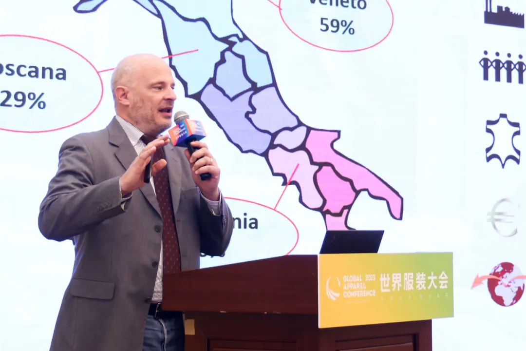 意大利琳瑯沛麗皮革協會CEO GIACOMO MARIA ZORZI作《服裝款式設計與面料的選擇匹配研究》報告。GIACOMO MARIA ZORZI簡要介紹了UNIC意大利制革行業貿易協會、ICEC皮革供應鏈業務認證機構、LINEAPELLE展覽會,其中LINEAPELLE是國際重要的皮革、配件、組件、面料、合成材料、鞋類展覽會。他指出,世界主要時尚和設計品牌都了解意大利模式,并認可其價值。他指出,風格創新是服裝款式設計的第一要素,意大利體系的優勢在于具有材料、技術和性能方面的創新能力,能確??蛻粽业綕M足風格要求的高水平產品。另外,綠色轉型也是服裝產業必須考慮的問題之一,在意大利有些公司已經能夠在染色階段將耗水量減少50%以上,有力促進了意大利紡織服裝業的可持續發展。