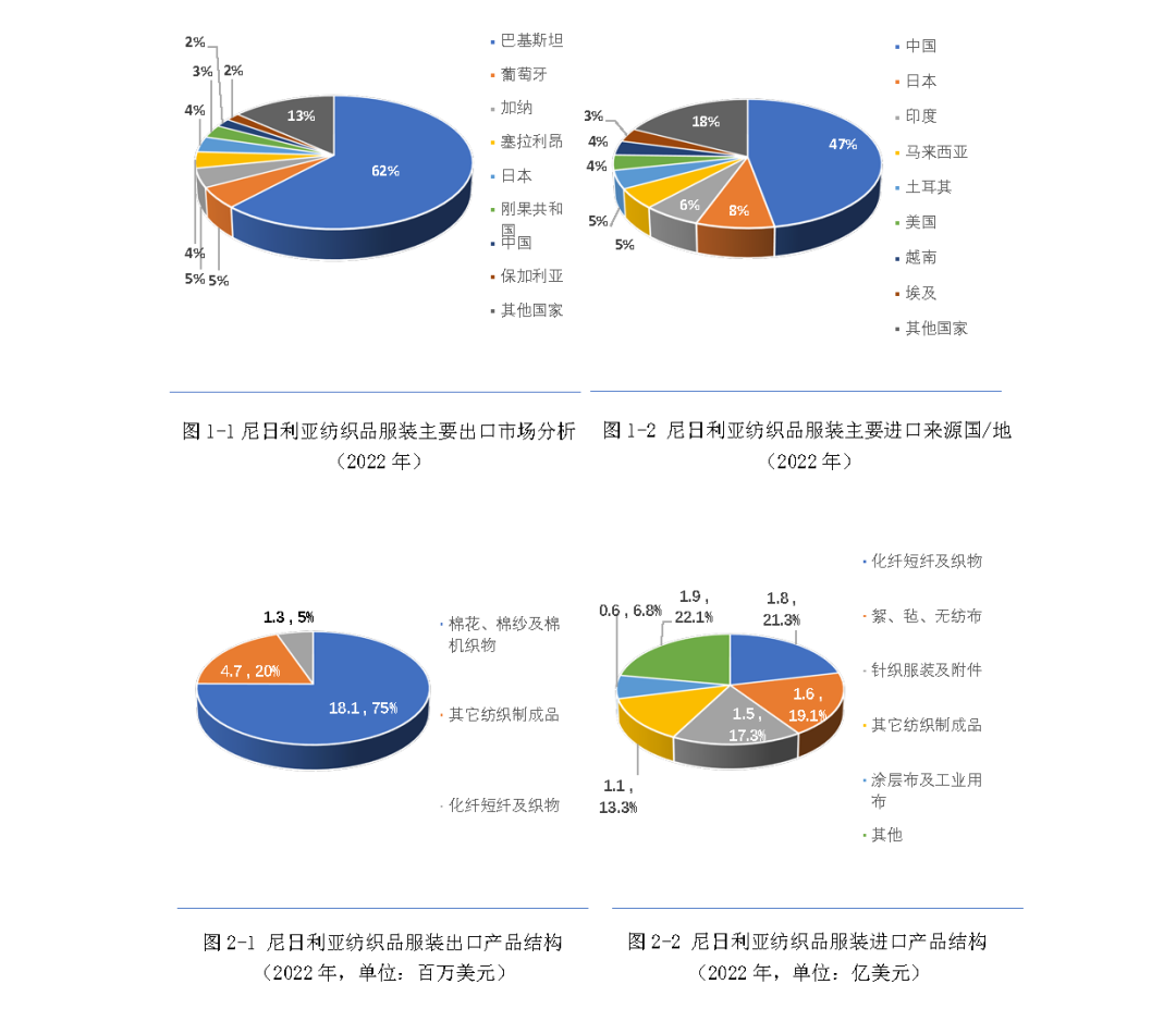 中國與尼日利亞于1971年建交,2005年兩國元首就雙方建立戰略伙伴關系達成共識,2018年兩國央行簽署了雙邊本幣互換協議,2021年兩國建立中尼政府間委員會機制。尼日利亞是中國在非洲的第一大工程承包市場、第二大出口市場、第三大貿易伙伴和主要投資目的地國。2022年,中尼雙邊貿易額為239億美元,其中紡織服裝產品是我國對尼出口的主要商品之一。