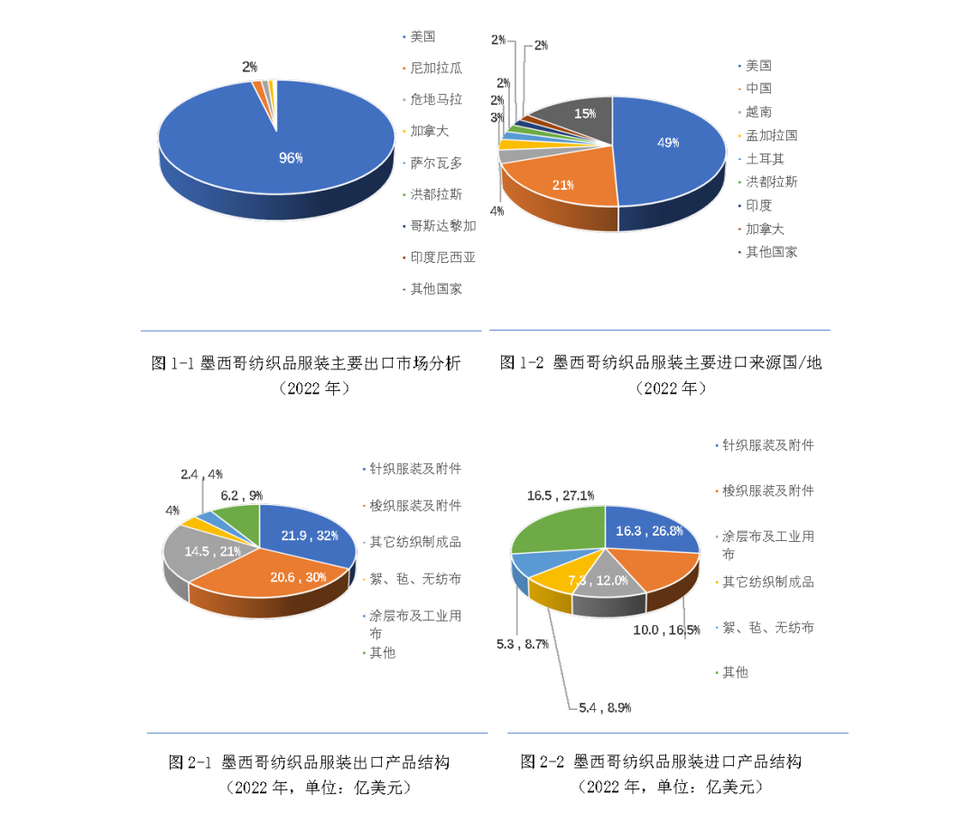 墨西哥紡織品服裝進口和出口規模相當,服裝同時是進口和出口的第一大品類,美國同時是第一大出口市場、第一大進口來源地。根據墨西哥國家統計局數據,2022年,墨西哥紡織品服裝(海關HS編碼50~63章紡織原料、紡織品及服裝)出口額為68.2億美元,對美國出口額在其對全世界出口額中占比高達96%,其次為尼加拉瓜(占比2%)。主要出口產品是針織服裝、梭織服裝和其他紡織制成品,其中服裝出口額占比為62%。同期,紡織品服裝進口額為60.2億美元,自美國進口占進口總額的49%,其次是中國(占比21%)、越南、孟加拉國。主要進口產品是針織服裝(占比26.8%),梭織服裝(占比16.5%),涂層布及工業用布(占比12%)等。