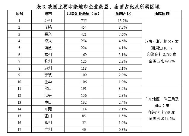 根據數據分析,全國印染企業保守數量5,505家,主要分布在太湖周邊和大灣區地區。以蘇州、無錫、嘉興、南通、紹興、常州等10市為代表的太湖流域,印染企業數量2,735家,全國占比49.7%;其次為以佛山、汕頭、中山、東莞等7市為代表的大灣區地區,印染企業數量779家,全國占比14.2%。上述兩地區印染企業合計數量3,514家,全國占比63.9%,見表3。