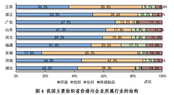 根據本文分類二,排污企業所屬行業分類簡化為紡織、印染、終端制品和化纖4個。從主要省份排污企業行業結構看,各地存在差異。江蘇省紡織(化纖噴水織造為主)企業和印染企業數量分別為2,442家和1,769家,占比分別為50.0%和36.2%;浙江省印染企業和紡織企業分別為1,227家和716家,占比分別為52.5%和30.6%;廣東省印染企業和終端制品企業數量分別為951家和240家,占比分別為67.9%和13.2%。此外,山東省、河北省和福建省以印染為主,安徽省以紡織為主,湖北省、河南省印染、紡織排污企業數量旗鼓相當,見圖4。