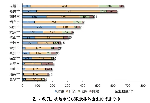 從主要地市排污企業數量和結構看,蘇州市紡織、印染、化纖和終端行業排污單位數量為2,005家、755家、143家和64家,除終端行業外均居地級市首位并遠多于其他地市。除蘇州外,主要15個發達地市排污企業數量在150-670家之間。15個城市中,湖州和杭州以紡織類排污企業居多。其他地市則以印染為主,企業數量占比多數超過50%,其中汕頭市印染企業占比最高,達到89.1%,見圖5。