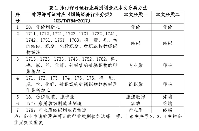 全國紡織服裝行業排污單位12,039家,其中紡織業10,284家,化纖制造業1,047家,紡織服裝、服飾業708家。在國民經濟行業分類基礎上,本文按照產業鏈環節對排污許可證所屬行業進行了重新分類,紡織:涉及棉、毛、麻、絲的初加工、紡紗、織造,化纖噴水織造的企業;專業染:專業從事印染單一產業環節的企業;紡織染:從事印染并且涉及紡紗、織造的企業;服裝服飾:服裝生產中涉及印染、洗水的企業;家紡:家紡產品生產中涉及印染的企業,與《國民經濟行業分類》(GB/T4754-2017)對應關系見表1。