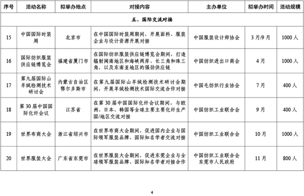 (五)加強國際交流對接。借助國際時裝周等平臺載體,加強設計師和服裝品牌間的國際交流,向全球展示優質的中國制造產品,培育國際經貿合作新增長點。在紡織行業國際會議期間,圍繞貿易、技術、社會責任等主題開展國際交流合作,提升國際資源整合能力。