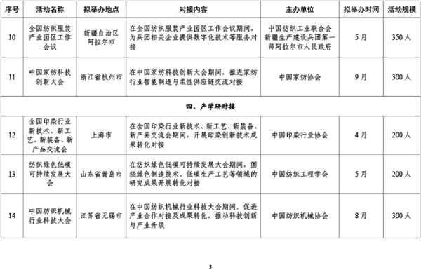 ?。ǘ┳⒅毓ぷ鲗嵭?。各主辦單位在開展活動時,要明確目標、壓實責任,嚴格按照中央八項規定及其實施細則精神做好相關工作。各項活動的出發點和落腳點應聚焦在提升行業供給能力、培育消費新增長點。要充分調動高校、科研院所、投融資機構、數字化轉型服務機構等的積極性,匯集各方優質資源,共同推動紡織服裝行業轉型升級。