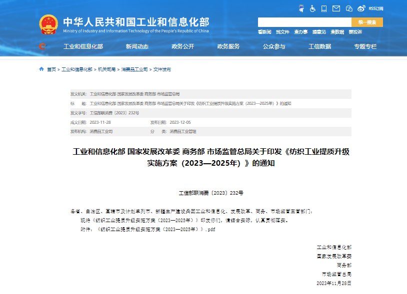 近日工業(yè)和信息化部、國家發(fā)展改革委、商務(wù)部、市場監(jiān)管總局等四部門聯(lián)合印發(fā)《紡織工業(yè)提質(zhì)升級實(shí)施方案(2023—2025年)》。