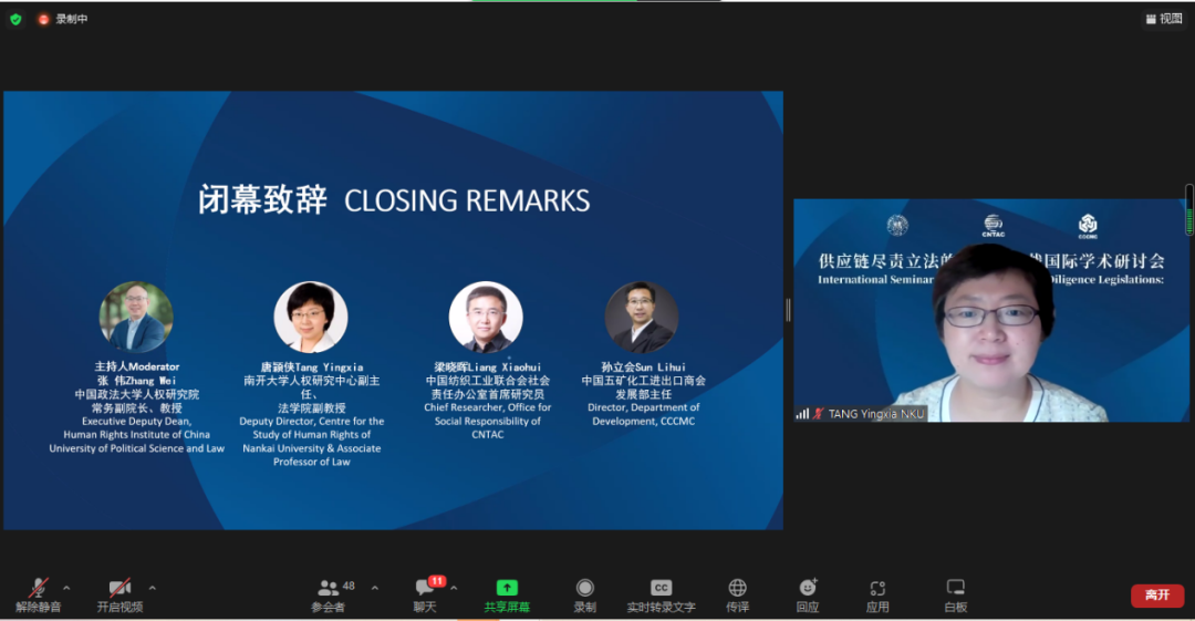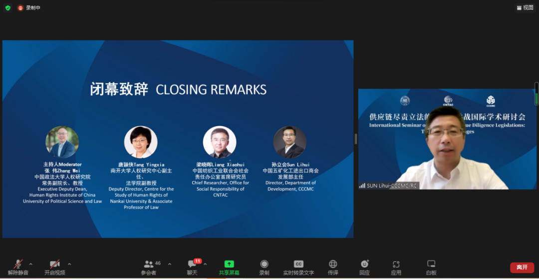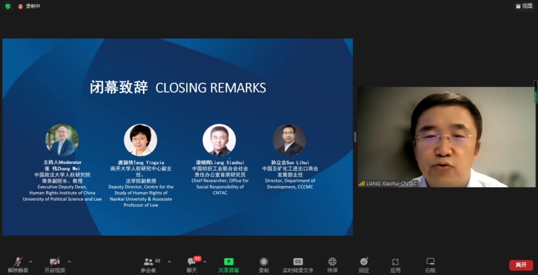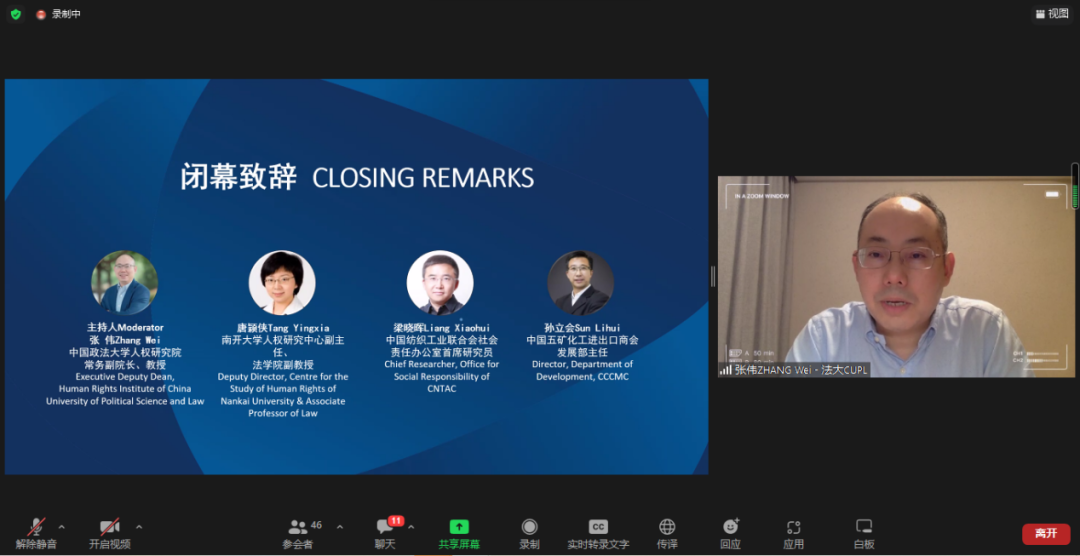 閉幕式由中國政法大學人權研究院常務副院長張偉教授擔任主持人,南開大學人權研究中心副主任唐穎俠副教授、中國紡織工業聯合會社會責任辦公室首席研究員梁曉暉博士和中國五礦化工進出口商會孫立會主任分別做了總結發言。