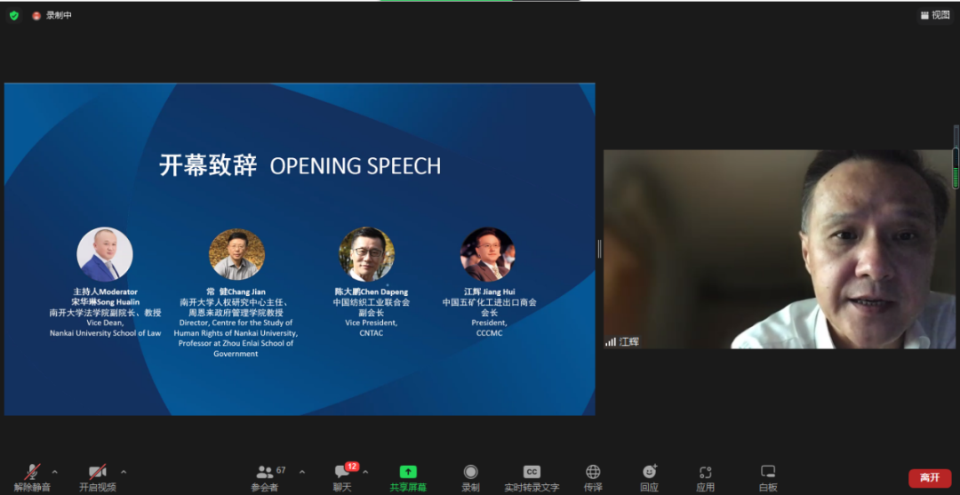 會議由南開大學法學院副院長宋華琳教授主持開幕式,南開大學人權研究中心主任常健教授、中國紡織工業聯合會副會長陳大鵬先生和中國五礦化工進出口商會會長江輝先生代表主辦方分別致辭。南開大學法學院作為南開大學人權研究中心的主要依托單位之一,對會議的舉辦給予了大力支持,中國紡織工業聯合會社會責任辦公室與責任鈷業倡議共同組織了本次會議。