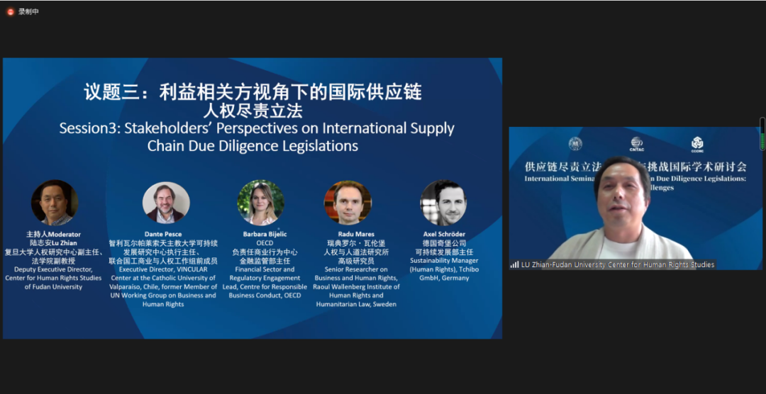 由復旦大學人權研究中心副主任陸志安副教授擔任主持人。智利瓦爾帕萊索天主教大學社會責任與可持續發展研究中心執行主任、聯合國工商業與人權工作組前成員Dante Pesce教授討論了強制性人權盡責立法的實施對發展中和新興經濟體的影響,經合組織(OECD)負責任商業行為中心金融監管部主任Barbara Bijelic 梳理了經合組織與強制性人權盡責立法的發展的關系,瑞典羅爾·瓦倫堡人權與人道法研究所高級研究員Radu Mares分析了歐盟企業可持續盡責指令對公司法以及企業管理職責的影響,德國奇堡公司可持續發展部主任 Axel Schröder分享了奇堡公司在應對供應鏈人權盡責立法方面的策略和經驗,及其對中國合作伙伴的建議和期望。