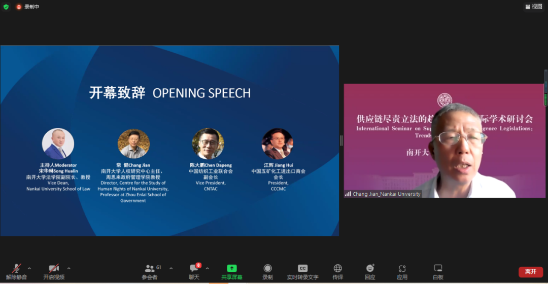 2022年6月15日,由南開大學人權研究中心主辦,中國紡織工業聯合會和中國五礦化工進出口商會合辦的“供應鏈盡責立法的趨勢與挑戰國際學術研討會”通過在線平臺順利舉行,超過一千八百人次實時觀看了此次研討會。