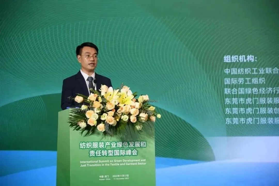 虎門鎮黨委副書記、鎮長吳慶球致辭。吳慶球表示,此次峰會為與會各方接觸國際視野、探尋轉型路徑、加快綠色發展提供了互動交流的平臺和難得的學習機會。虎門鎮將認真貫徹落實黨的二十大報告中關于“推動綠色發展,促進人與自然和諧共生”的重大部署要求,按照“科技、時尚、綠色”的行業發展方向,攜手中國紡織工業聯合會建設“世界級紡織服裝產業集群先行區”,把綠色轉型與數字化轉型有機結合起來,引導企業建設智慧工廠,構建全產業鏈生態體系,進一步提高虎門產業的綠色競爭力,努力在紡織服裝業綠色發展與公平轉型上作出虎門實踐。