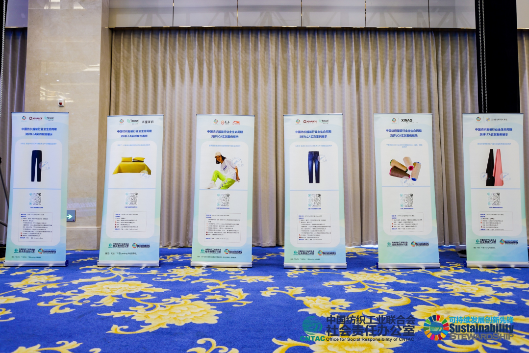 會場兩側展示了CNTAC-LCA工作組的碳足跡測評案例,這些案例涵蓋了童裝、牛仔褲、西裝、家紡等不同紡織產品的實測碳足跡,為其他企業和產品提供了參考和啟示。通過這些案例,與會者可以更直觀地了解碳足跡測評的方法和實際應用,進一步推動行業的低碳發展。