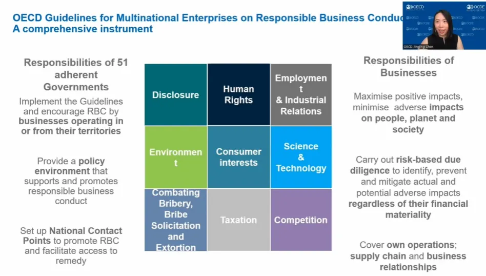 經(jīng)合組織(OECD)金融和企業(yè)事務(wù)局負(fù)責(zé)任商業(yè)行為中心政策顧問(wèn)及國(guó)別負(fù)責(zé)人陳晶晶女士通過(guò)視頻形式介紹了經(jīng)合組織的盡責(zé)管理標(biāo)準(zhǔn)、方法及其對(duì)品牌與供應(yīng)商關(guān)系的影響。