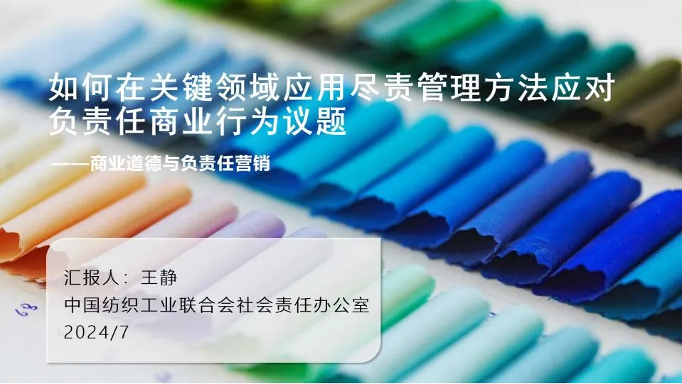 中國(guó)紡織工業(yè)聯(lián)合會(huì)社會(huì)責(zé)任辦公室研究員王靜女士就《如何在關(guān)鍵領(lǐng)域應(yīng)用盡責(zé)管理方法應(yīng)對(duì)負(fù)責(zé)任商業(yè)行為議題》,和參會(huì)嘉賓探討了ESG與盡責(zé)管理的關(guān)系,介紹了行業(yè)營(yíng)銷(xiāo)實(shí)踐中的常見(jiàn)風(fēng)險(xiǎn)因素,并詳細(xì)解讀了如何運(yùn)用盡責(zé)管理工具管控商業(yè)賄賂與貪腐風(fēng)險(xiǎn),號(hào)召企業(yè)加強(qiáng)合規(guī)管理。