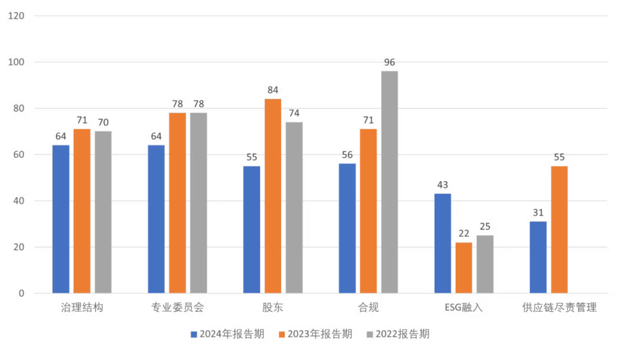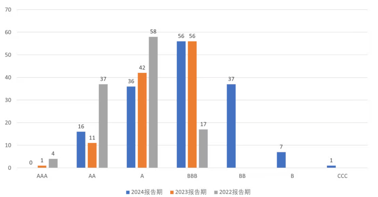 公司治理評估中,上市企業信息披露差異性相較其他維度較小。相較于2023報告期,評估結構明顯下沉,BBB及以上企業比例下降,BB級比例更由不到5%跳升至三成以上,并首次出現B級和CCC級企業,尾部風險顯著抬升。造成這種變化的首要原因是供應鏈盡責管理要求的提升。