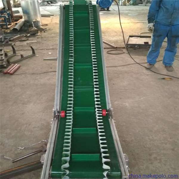 1、帶裙邊的輸送皮帶:裙邊皮帶輸送機的輸送帶的結(jié)構(gòu)形式為中間低的平面皮帶輔以兩邊高的類似裙邊的橡膠帶組合而成,這種設(shè)計,能夠較好的防止物料灑落;其平面皮帶上,通常在一定的間距會有一定高度的橡膠擋板,這種結(jié)構(gòu)能夠很好的將物料輸送到較高位置。